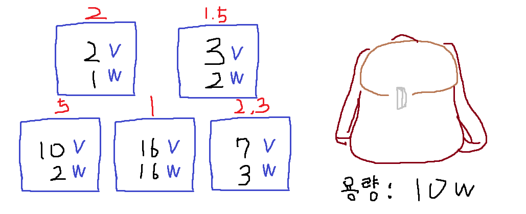 v는 아이템의 이익, w는 아이템의 무게입니다,