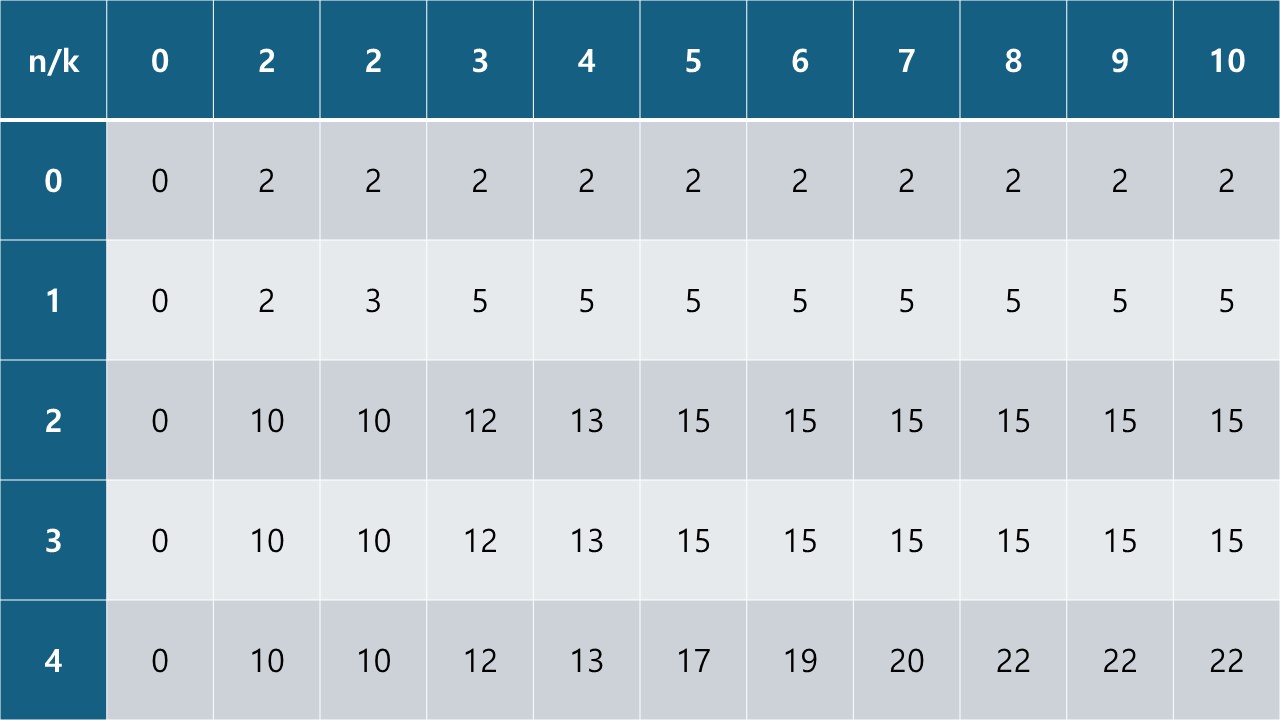 2차원 배열이고 x축은 고려하는 아이템의 번호 n, y축은 하중 제한 k, 원소의 값은 정의와 같습니다.