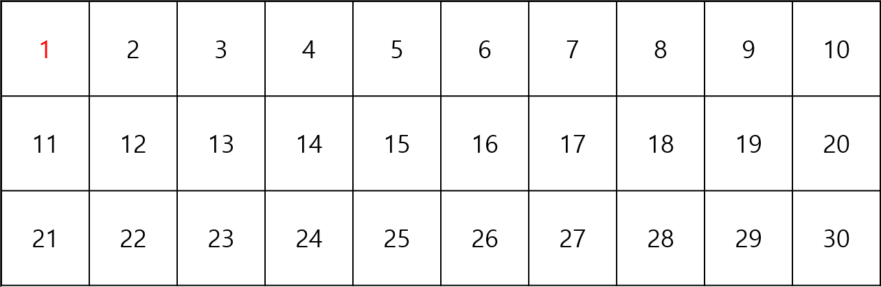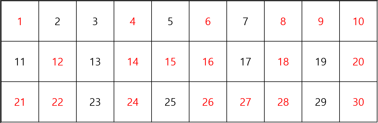 마지막으로 5의 배수까지 표시하고 나면 표에는 더 이상 소수가 아닌 수가 남지 않습니다. 1부터 30까지의 소수를 모두 구한 건데요. 체라는 표현이 이해가 되는 거 같으면서도 잘 모르겠네요.